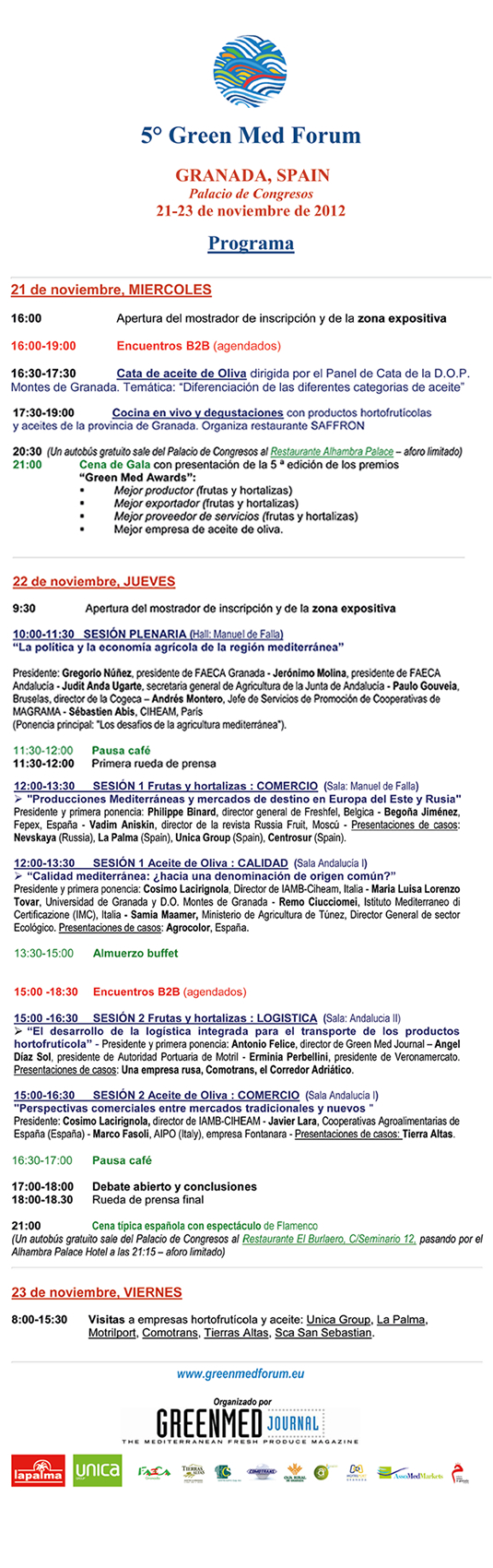 | |  | | Granada acoge esta semana la V edición del Green Med Forum, un encuentro sobre economía agrícola euro-mediterránea centrado en los sectores hortofrutícola y de aceite de oliva que se celebrará en el Palacio de Congresos del 21 al 23 de noviembre. La Federación Andaluza de Empresas Cooperativas Agrarias, FAECA-Granada es la entidad anfitriona de este prestigioso foro internacional, organizado por el grupo editorial Green Med Journal, que por primera vez se celebra en España con el apoyo del Puerto de Motril, cooperativas agroalimentarias, instituciones y entidades del sector. |  | | FAECA-Granada impulsó la candidatura granadina para celebrar este evento considerándolo un marco de relevancia para la promoción de las producciones hortofrutícolas y el aceite de oliva de Granada y Andalucía. Después de meses de trabajo y tras estudiar las candidaturas de Madrid, Valencia o Barcelona, el comité organizador eligió finalmente la provincia de Granada, valorando el potencial del sector hortofrutícola y de aceite de oliva andaluz, en concreto el granadino, situado entre los principales referentes de calidad y exportación de nuestra región. |  | | El potencial de nuestro sector olivarero con Andalucía como principal exportadora de aceite de oliva del mundo, el carácter exportador de las empresas cooperativas, unido a la cercanía y apoyo del MotrilPort y Puerto de Motril, ente que ofrece una logística de calidad y cercana facilitando conexiones con todo el mundo, y la implantación nacional de la empresa de transporte motrileña, Comotrans fueron los valores definitivos a la hora de concretar la sede en esta ciudad. |  | | El Green Med Forum contará con la presencia de las cooperativas más importantes de frutas y hortalizas y de aceite de oliva de Granada. GRANADA LA PALMA SCA, el primer productor mundial de tomate cherry (www.lapalmacoop.com); EL GRUPO SCA, principal productora de pepino de Granada (www.elgrupo-sca.com); ACEITE DE GRANADA “TIERRAS ALTAS” cooperativa de 2º grado de aceite de oliva que aglutina 16 cooperativas granadinas (www.tierrasaltas.es); CENTRO SUR SCA es la principal productora y comercializadora de espárragos de la Unión Europea y la única en el mundo que comercializa un espárrago triguero con Indicación Geográfica Protegida “Huétor Tájar” (www.esparragodehuetortajar.com/esparragos-trigueros) y la cooperativa PROCAM especializada en el cultivo ecológico de hortícolas y frutas subtropicales (www.procamsca.com) y SAN SEBASTIÁN SCA (Benalúa de las Villas), productora de aceite de oliva (www.sansebastiansca.org) . |  | |