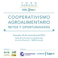 | |  | | El viernes 23 de noviembre, tendr lugar el Foro Agrario Cooperativismo Agroalimentario. Retos y retos organizada por Fundacin CajaGranada y Fundacin Cajasol, con la colaboracin de Cooperativas Agro-alimentarias de Granada. El encuentro tendr lugar en la sede de la Fundacin CajaGranada a partir de las 9 horas. |  | | Cooperativas Agro-alimentarias de Granada destaca el inters de este foro en el que relevantes autoridades y representantes de la Federacin de Cooperativas, junto a otros agentes del sector, abordarn cuestiones estratgicas para la agricultura y las empresas agroalimentarias, como la reforma de la PAC 2021-2027, entre otros asuntos de inters. |  | | Inaugurarn la jornada Mara Elena Martn-Vivaldi, presidenta de la Fundacin CajaGranada y Antonio Pulido, presidente de la Fundacin Cajasol. La primera ponencia ser a cargo del Consejero de Agricultura, Pesca y Desarrollo Rural, Rodrigo Snchez, quien realizar el anlisis y posicionamiento desde el Gobierno andaluz. A continuacin, la eurodiputada y vicepresidenta de la Comisin de Agricultura del Parlamento europeo, Clara Aguilera Garca, ofrecer visin de este sector desde las instituciones comunitarias. |  | | A las 12 horas, la jornada continuar con una mesa redonda que abordar el posicionamiento de representantes de cooperativas y agricultores en torno a la nueva PAC 2021-2027, los cambios en el cooperativismo y el comercio internacional, entre otros factores clave. Intervendrn el director general de Cooperativas Agro-alimentarias de Espaa, Agustn Herrero; el secretario general de UPA Andaluca, Miguel Cobos y el director General de ASAJA Andaluca, Vicente Prez. |  | |
